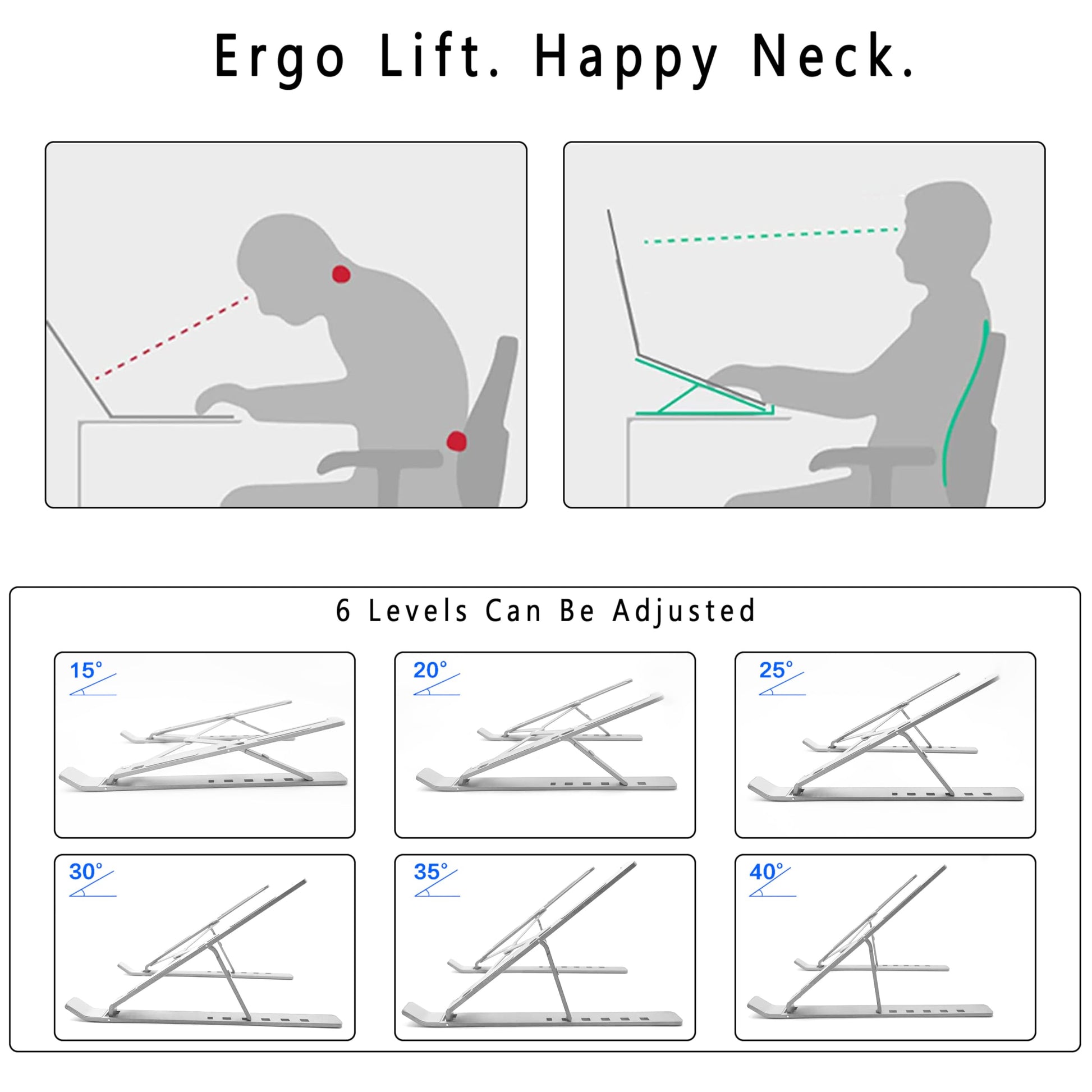 This AiTodos® aluminum laptop stand features six adjustable height settings to achieve proper ergonomic positioning, reducing neck and back strain during extended work sessions.