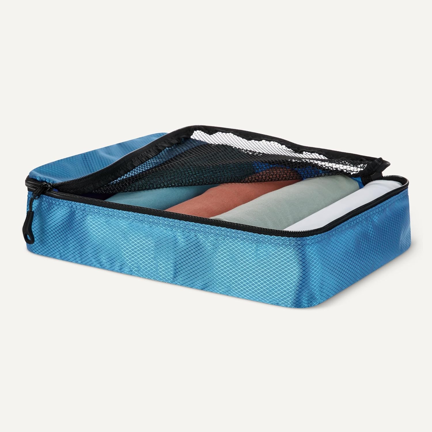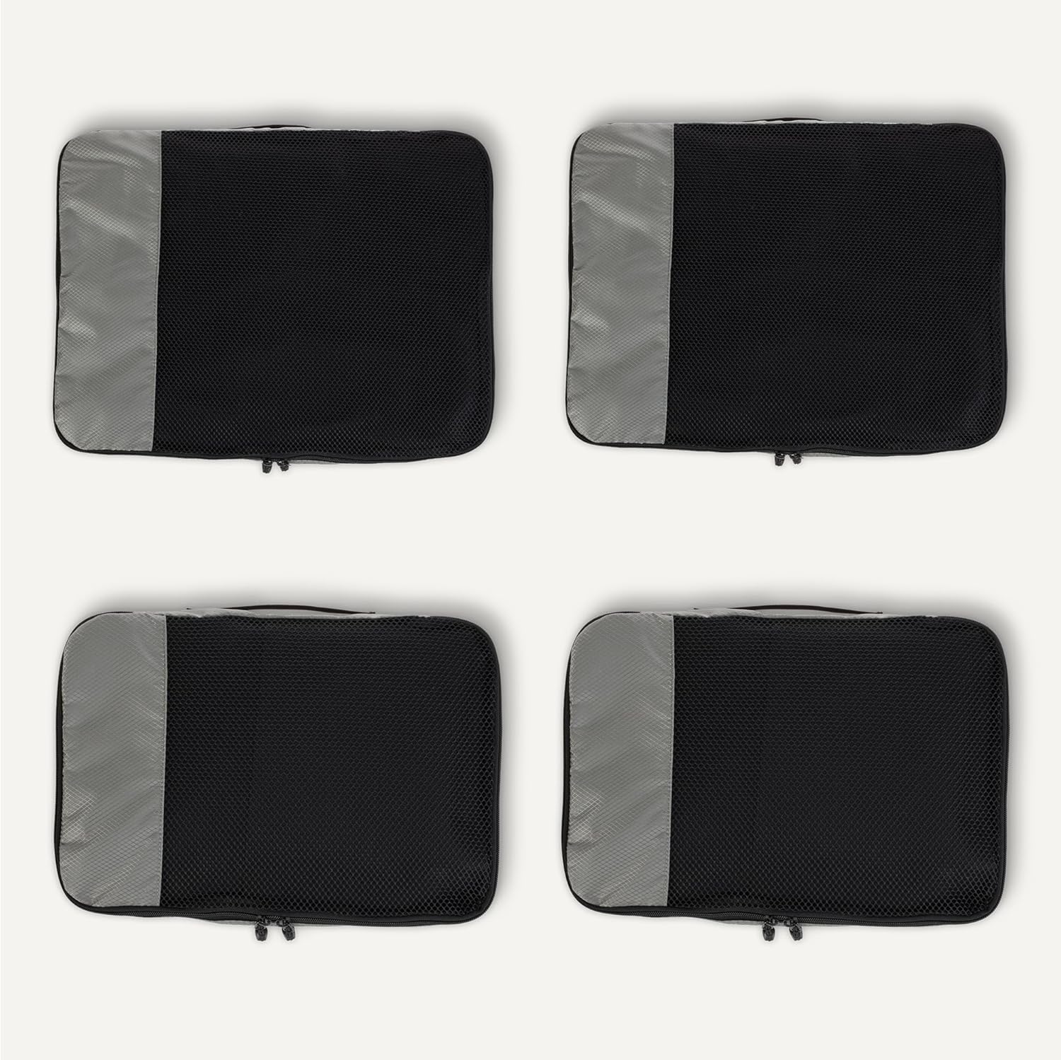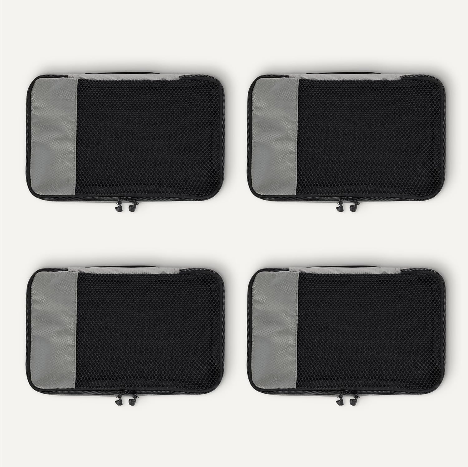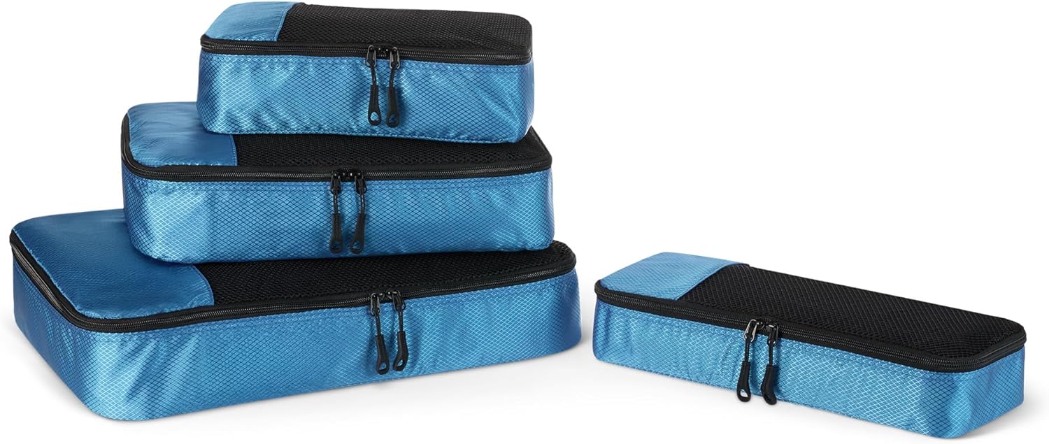 Pack smart with these Amazon Essentials medium packing cubes. This set of 4 features mesh panels for instant visibility, reinforced double zippers for durability, and compact 35.6 × 25.4 × 7.5 cm dimensions that fit seamlessly into suitcases, backpacks, and storage spaces. Organize by clothing type—sweaters, shirts, underwear, socks—and locate items instantly without unpacking. Lightweight polyester construction with sturdy seams handles frequent travel and home storage. Each cube includes a carry handle and is machine washable for convenient maintenance.