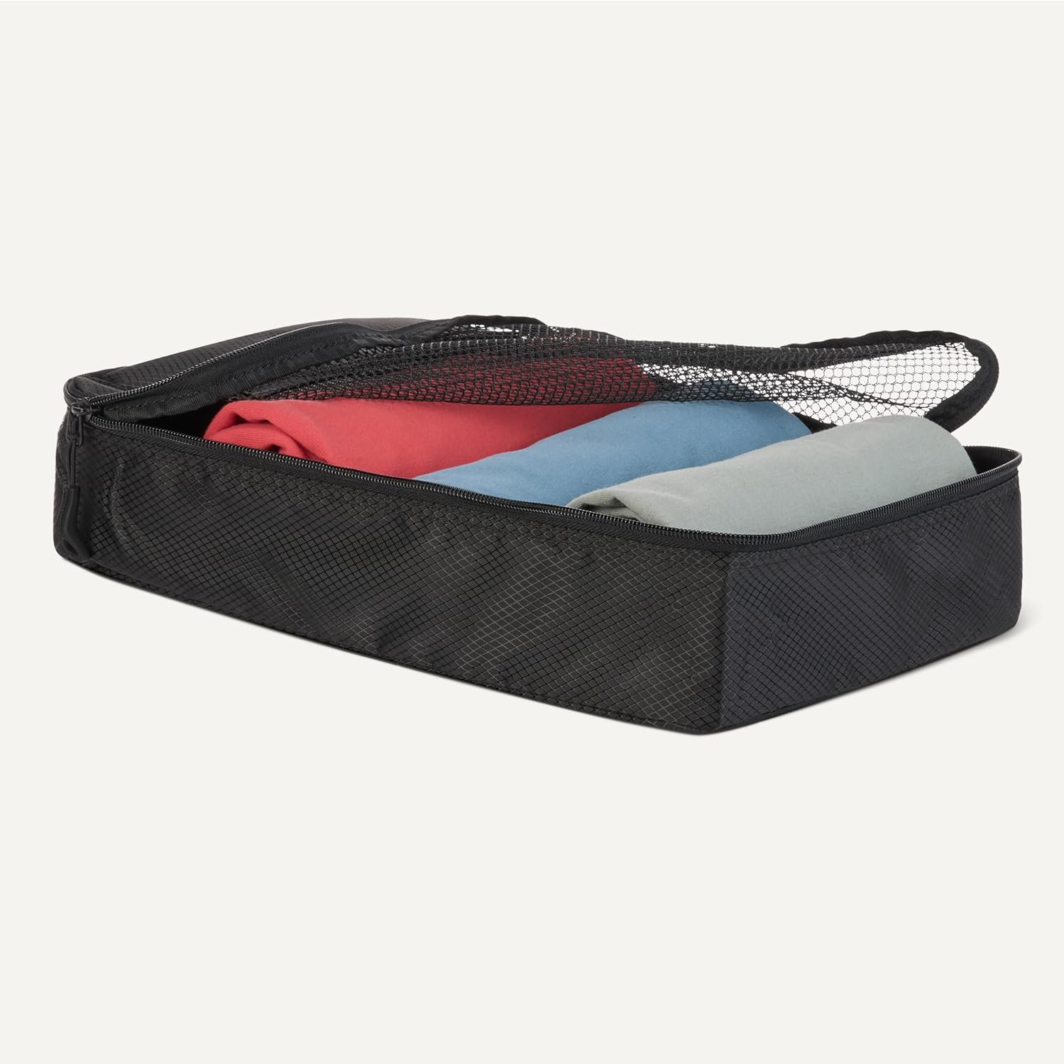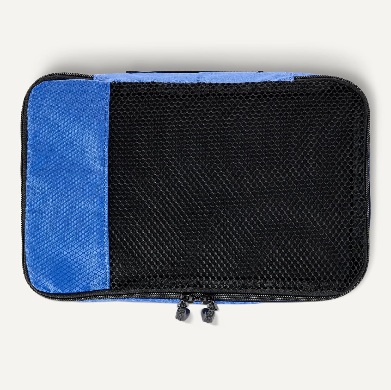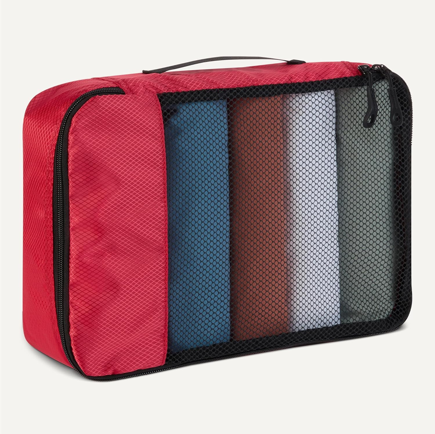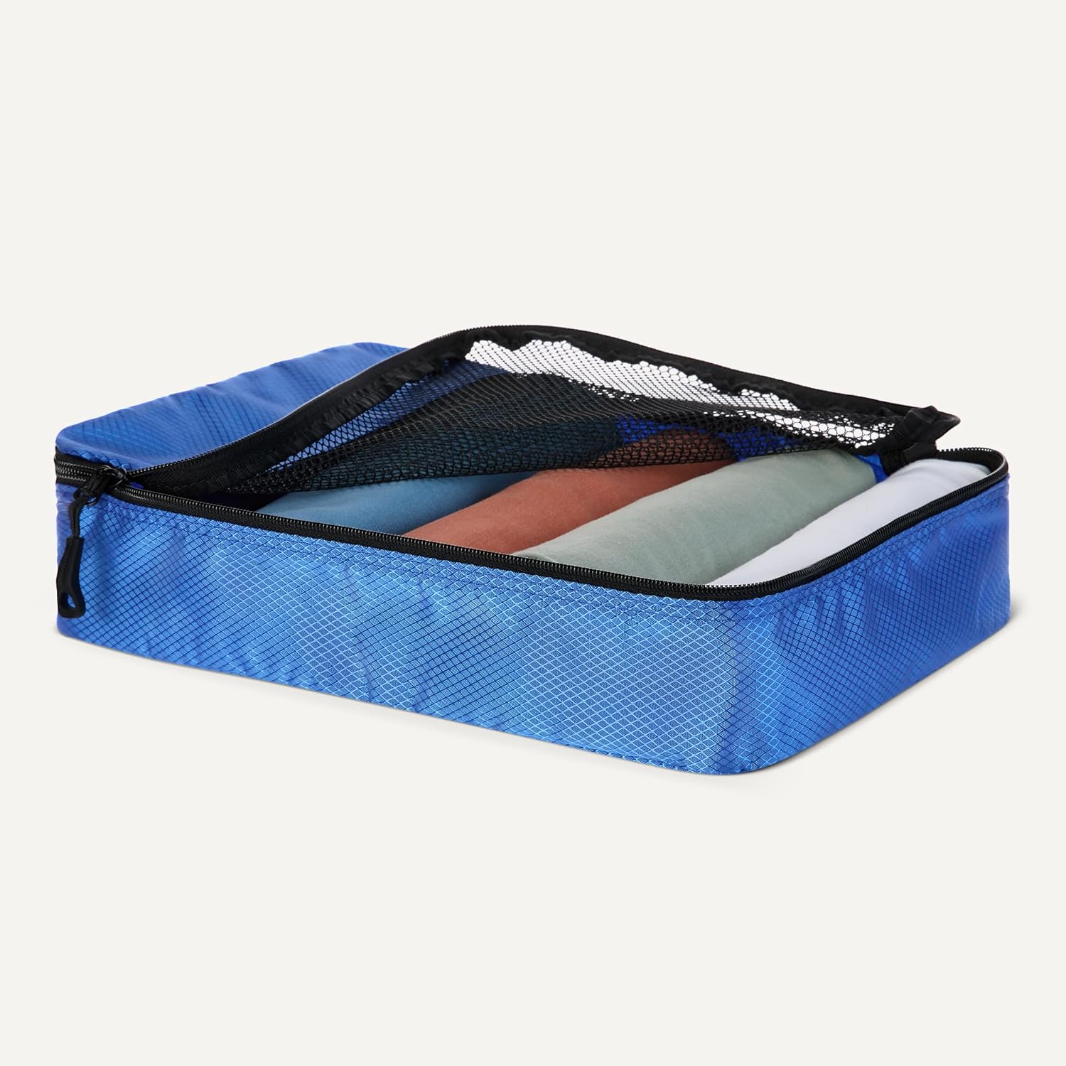 Pack smart with these Amazon Essentials medium packing cubes. This set of 4 features mesh panels for instant visibility, reinforced double zippers for durability, and compact 35.6 × 25.4 × 7.5 cm dimensions that fit seamlessly into suitcases, backpacks, and storage spaces. Organize by clothing type—sweaters, shirts, underwear, socks—and locate items instantly without unpacking. Lightweight polyester construction with sturdy seams handles frequent travel and home storage. Each cube includes a carry handle and is machine washable for convenient maintenance.
