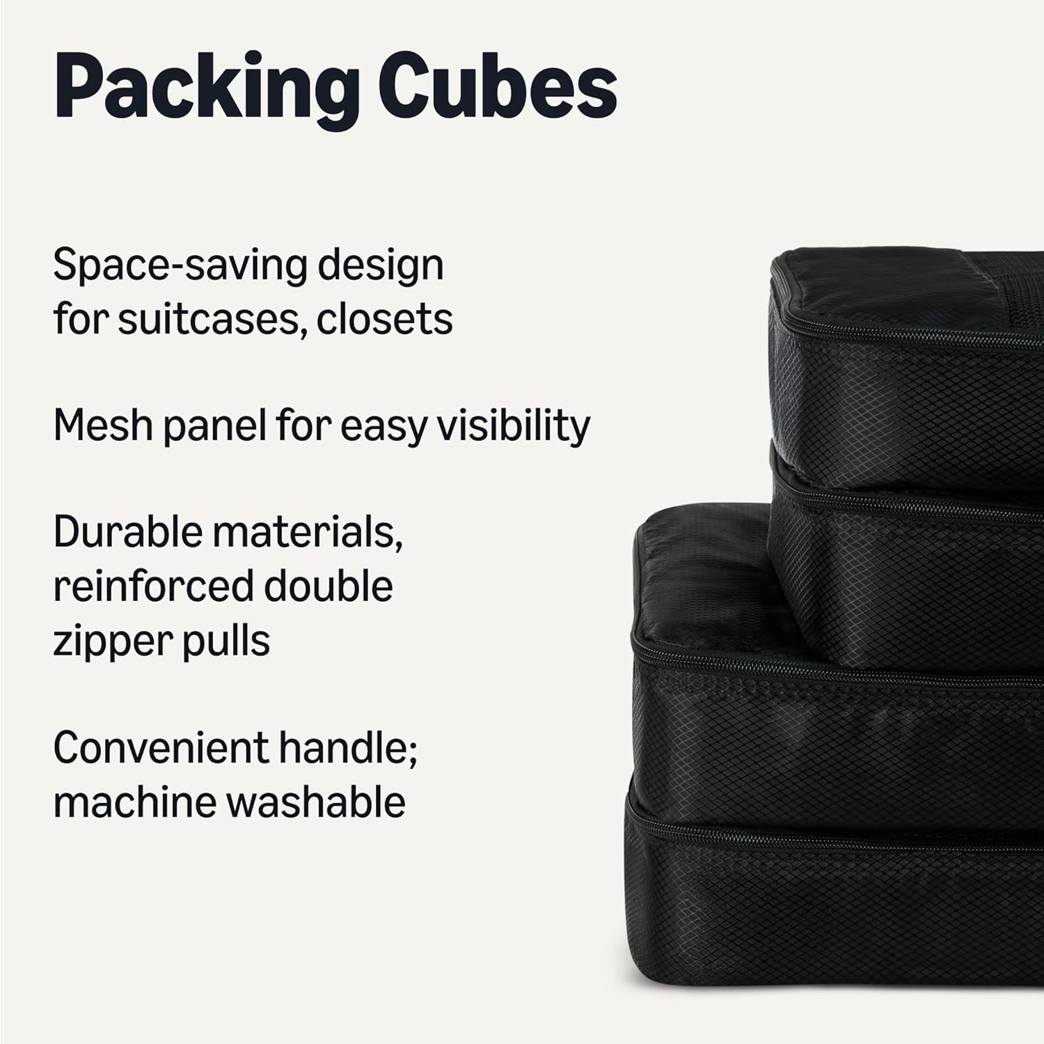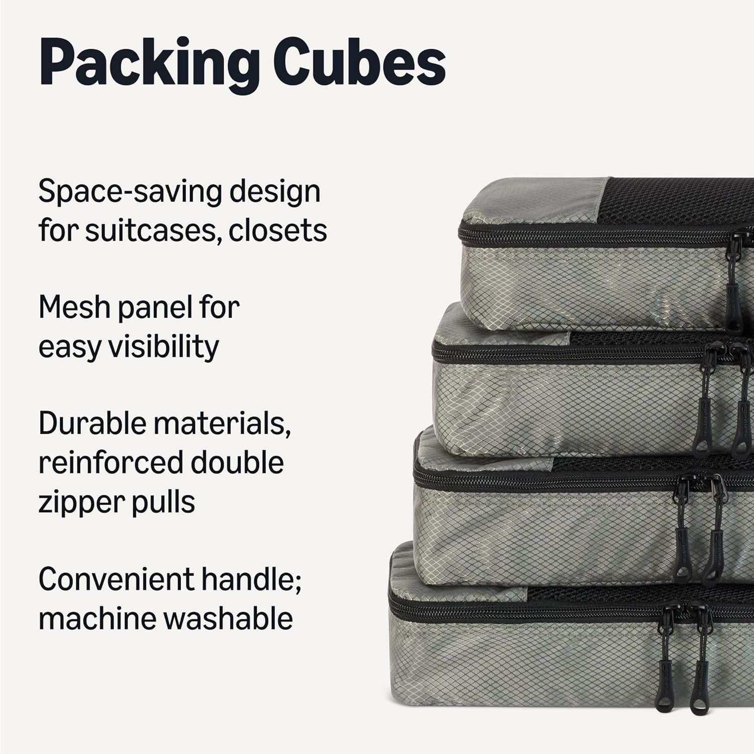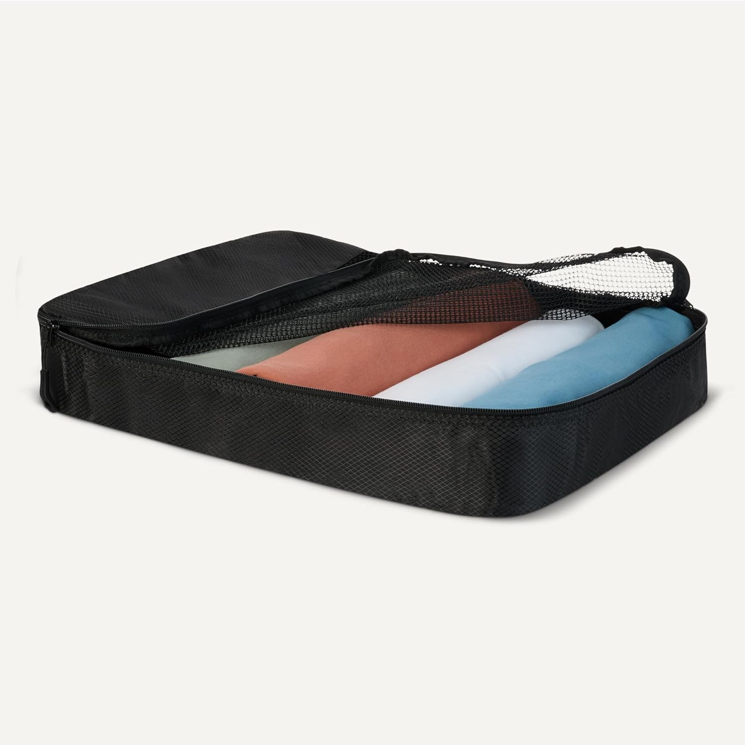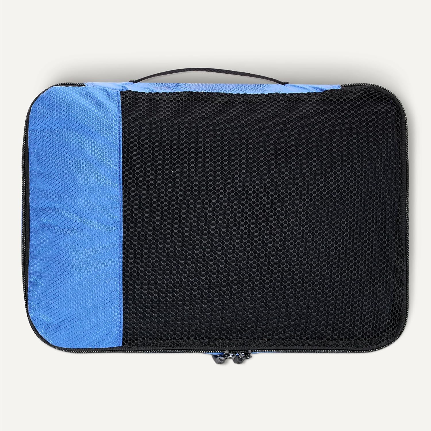 Pack smart with these Amazon Essentials medium packing cubes. This set of 4 features mesh panels for instant visibility, reinforced double zippers for durability, and compact 35.6 × 25.4 × 7.5 cm dimensions that fit seamlessly into suitcases, backpacks, and storage spaces. Organize by clothing type—sweaters, shirts, underwear, socks—and locate items instantly without unpacking. Lightweight polyester construction with sturdy seams handles frequent travel and home storage. Each cube includes a carry handle and is machine washable for convenient maintenance.