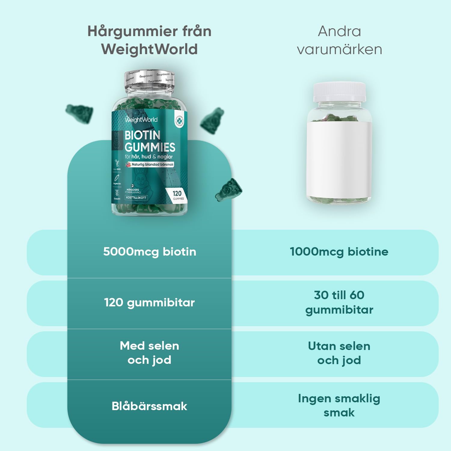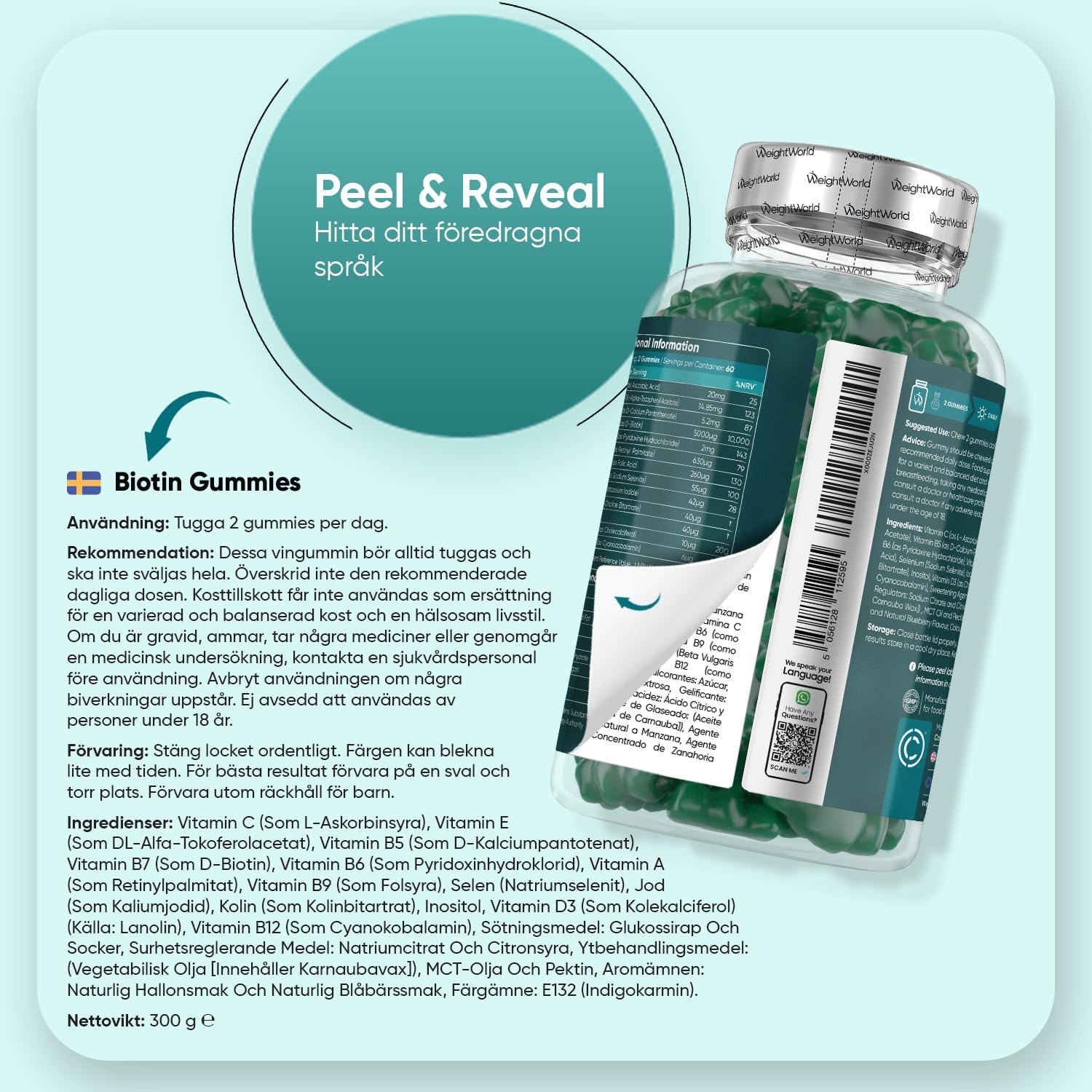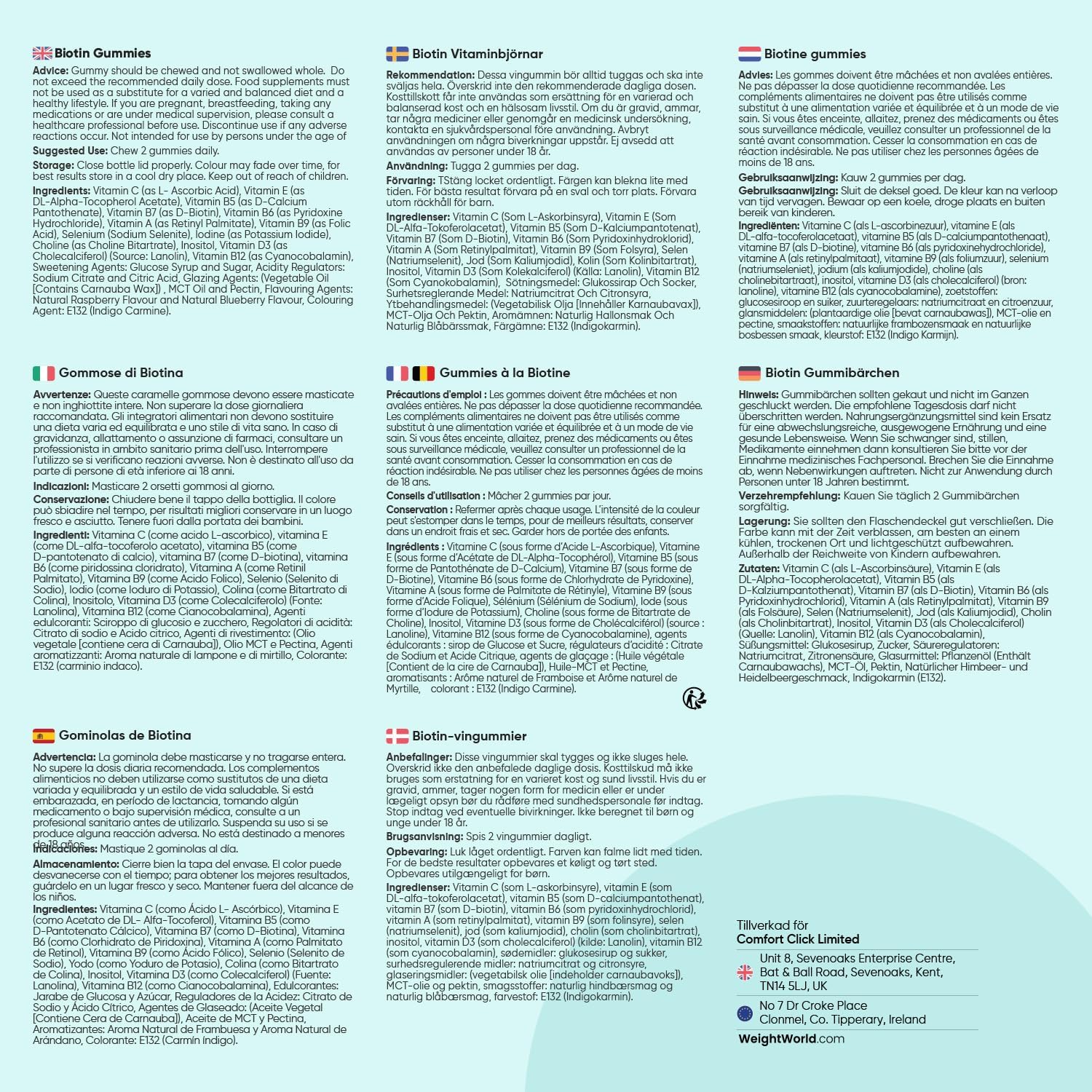Biotin Gummy Bears with Vitamin C & E support healthy hair, skin, and nails through a comprehensive blend of B-vitamins, antioxidants, and minerals. Each serving delivers biotin, vitamins C and E, selenium, and iodine to promote normal energy metabolism and skin health. These vegan, gluten-free gummies offer a convenient chewable alternative to capsules, requiring no water. With 120 pieces per bottle and GMP certification, they provide two months of daily supplementation in a naturally berry-flavored format.