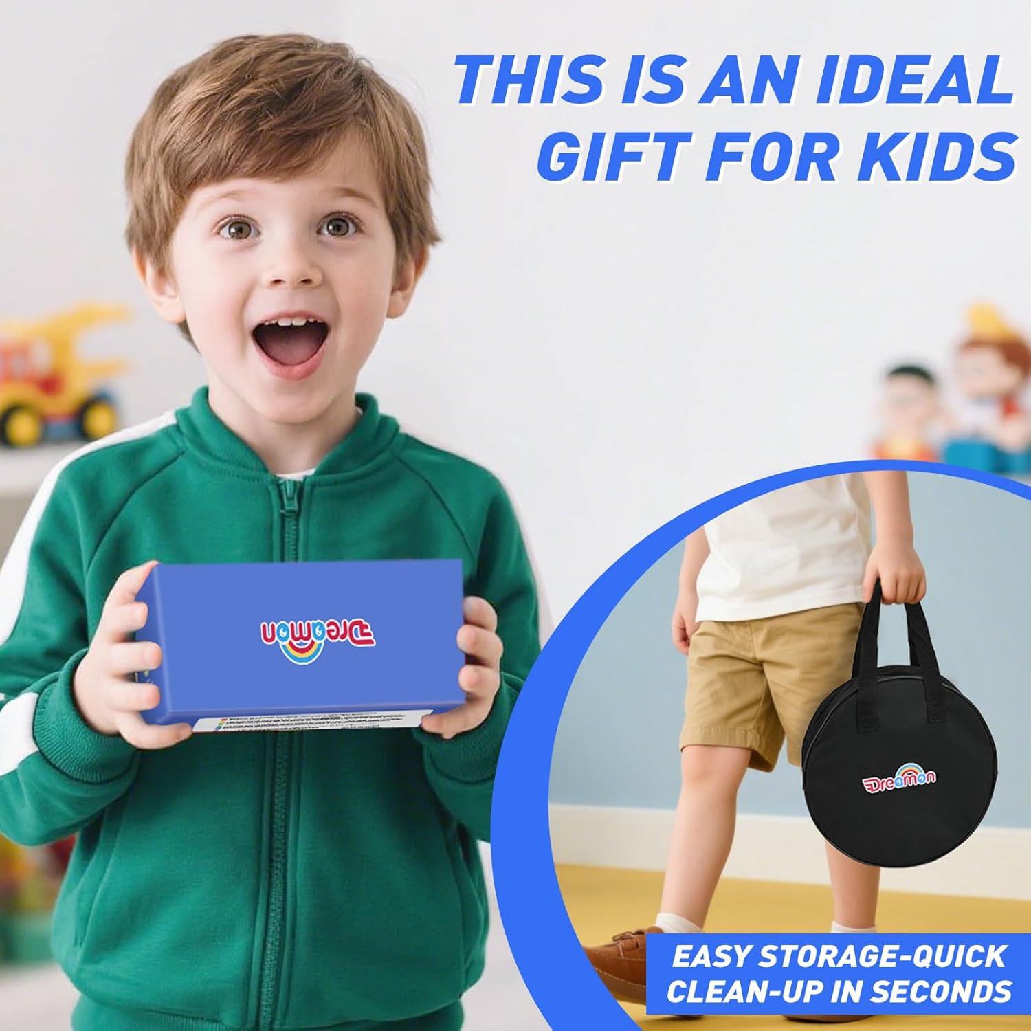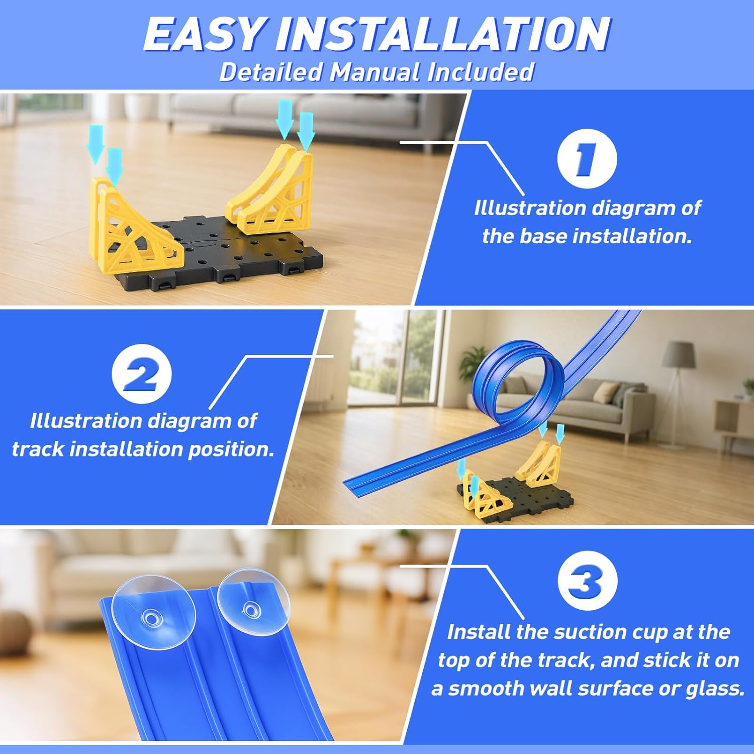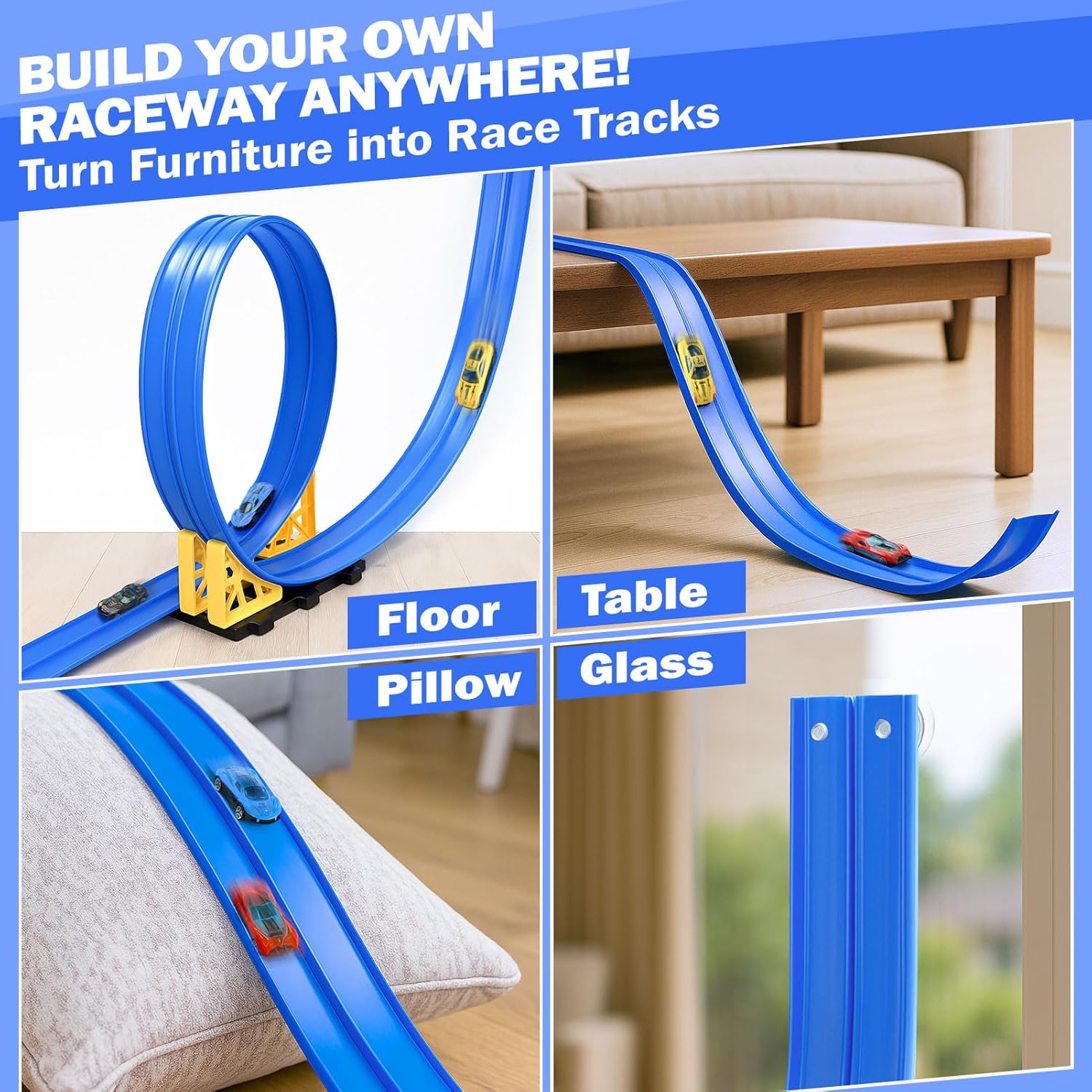 Dreamon Race Track Kids 3-6 Years - 5m Track A complete racing set featuring a 5-meter double track, 4 aluminum alloy cars, 2 ramps, 2 sockets, 4 suction cups, and storage bag. Build loopings and ramps for varied track designs. Compatible with most die-cast cars and powered by gravity—no batteries needed. Develops hand-eye coordination, problem-solving, and spatial thinking through screen-free play. Ideal gift for ages 3-8.