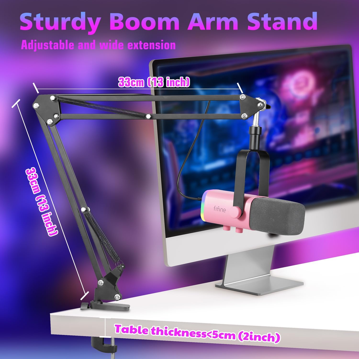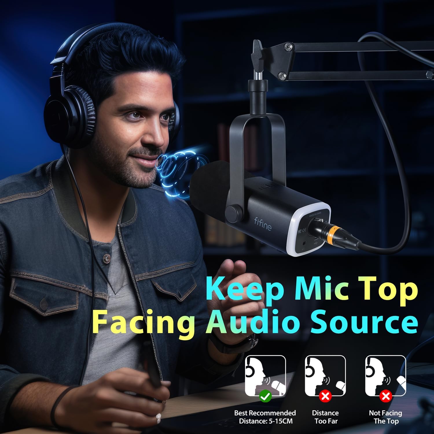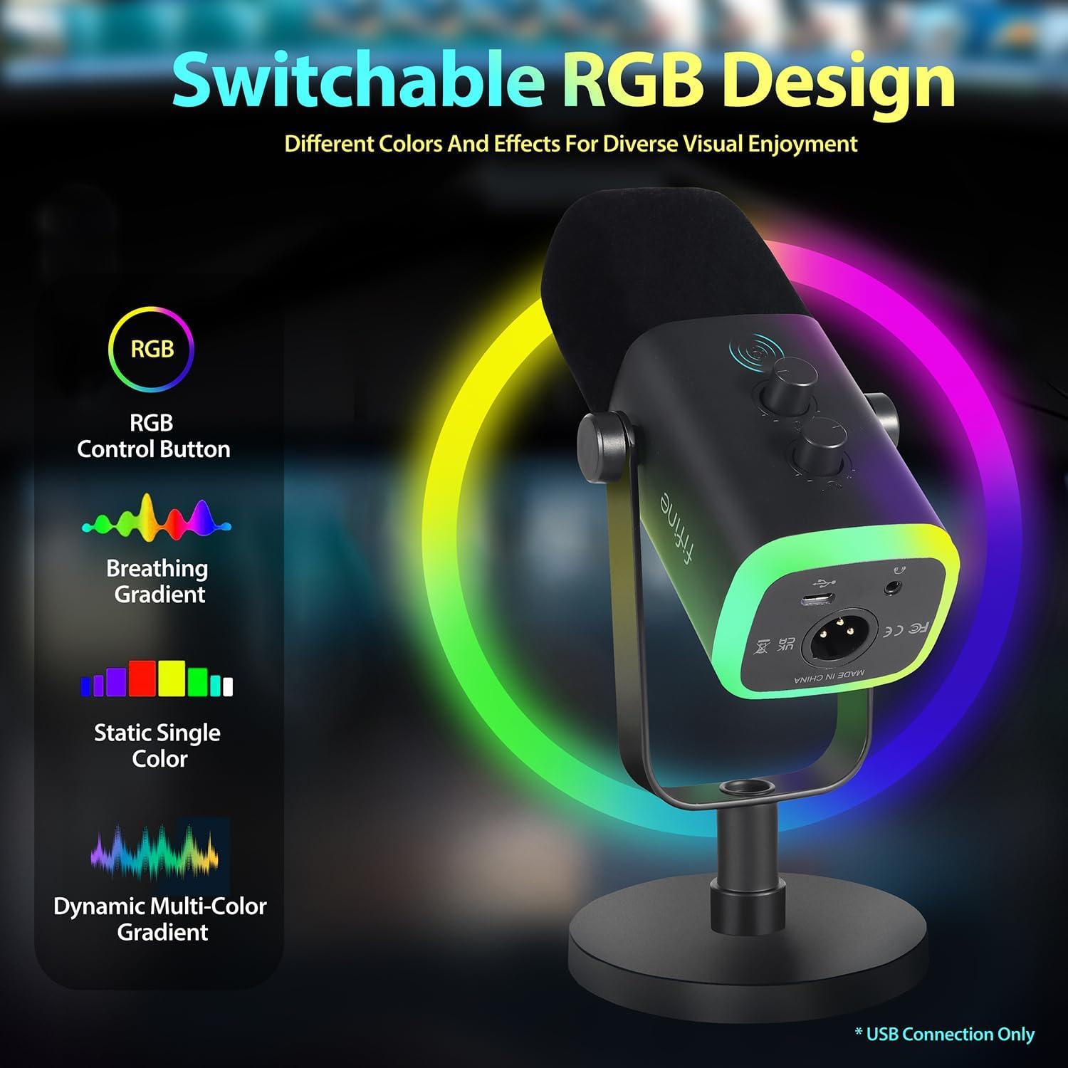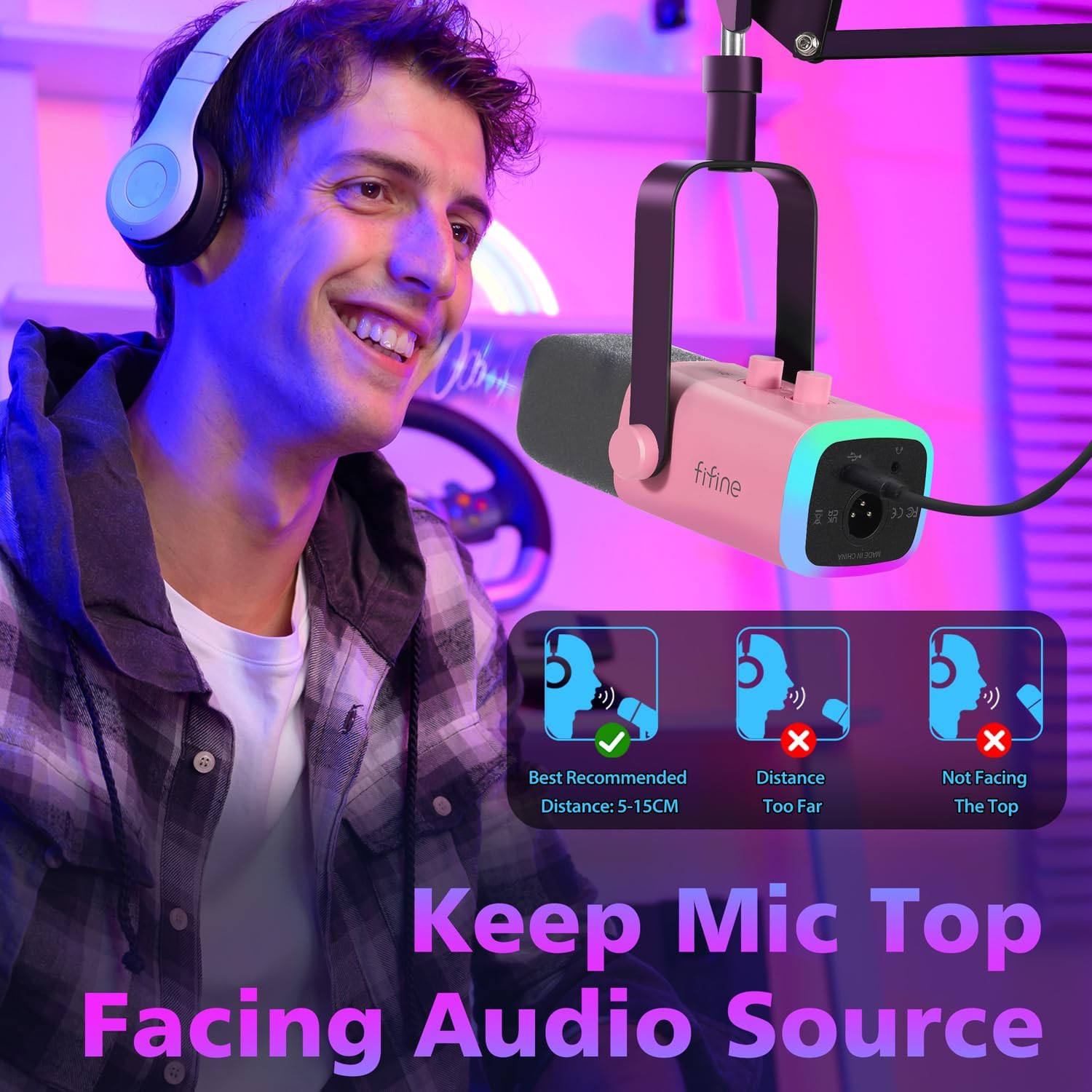 FIFINE MI14 USB/XLR streaming microphone delivers professional-grade audio for gaming, podcasting, and broadcasting. Dual connectivity supports PC, PS4/PS5, mixers, and sound cards. Features customizable RGB lighting, articulated arm, gain control, and headphone monitoring jack. Dynamic cardioid capsule captures clear vocals while rejecting background noise. Complete with stand and accessories for immediate setup.