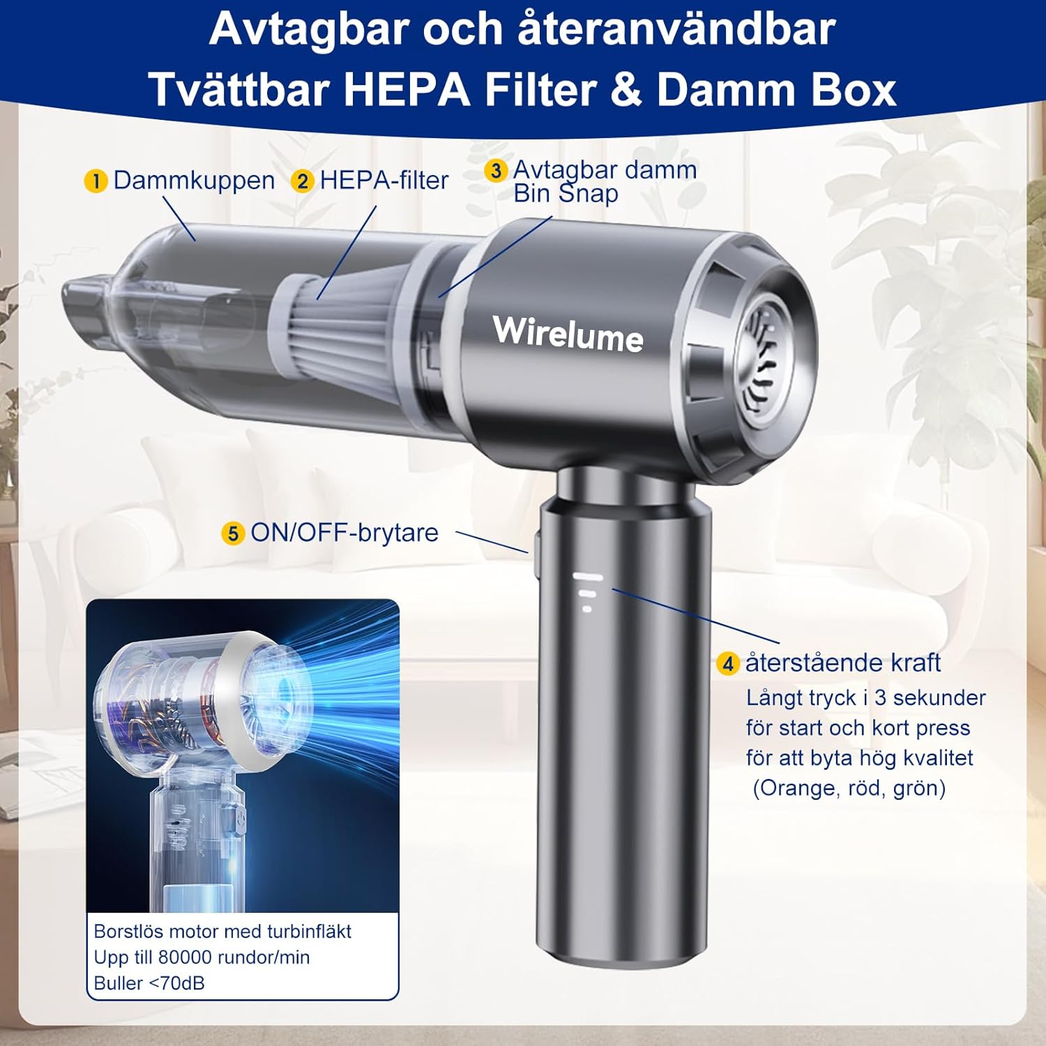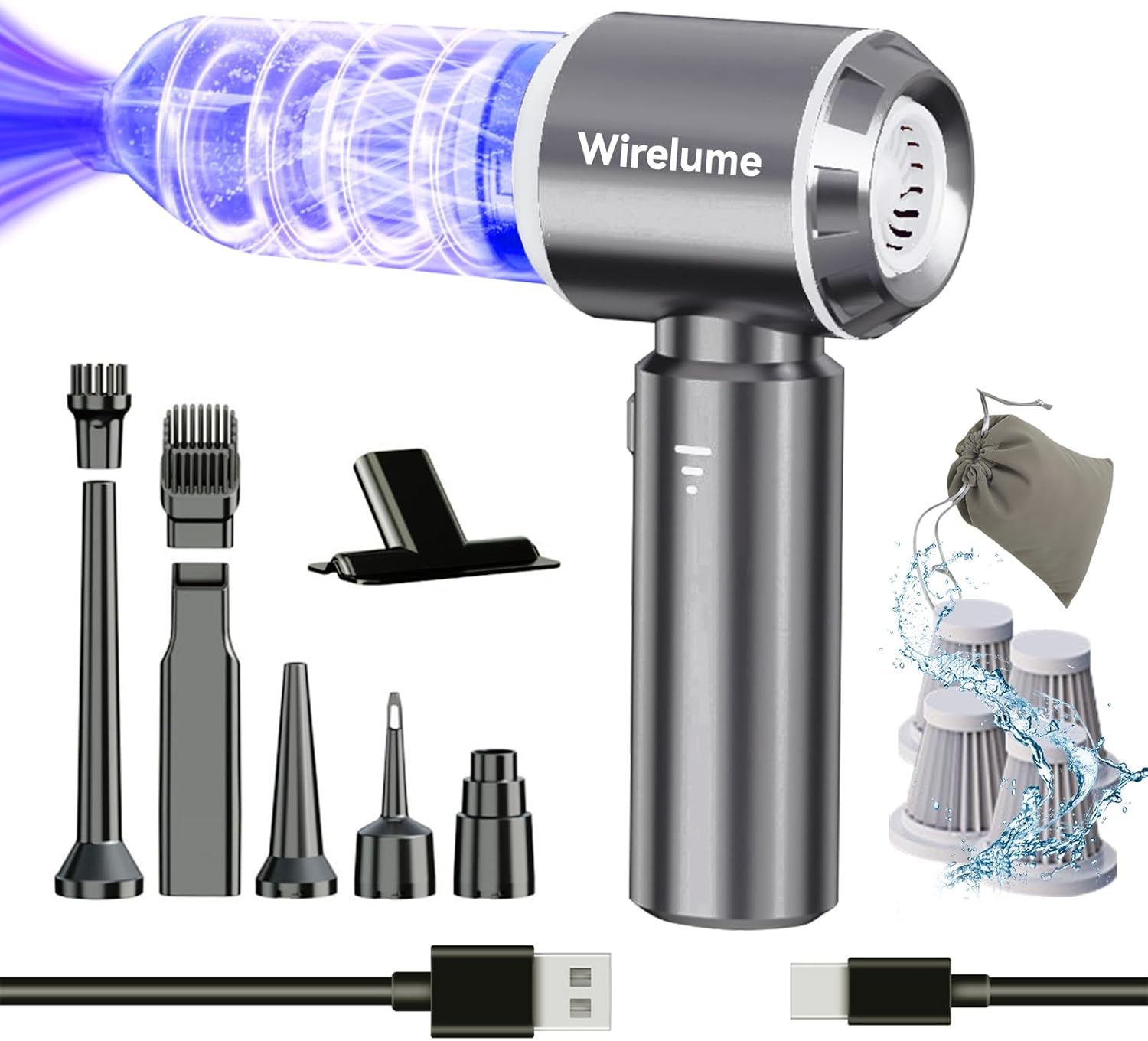 The Wirelume cordless handheld vacuum delivers 22000Pa suction power with a 120W brushless motor, ideal for cars, furniture, and home cleaning. Weighing just 0.82 lbs, this lightweight portable cleaner operates quietly below 70dB and runs up to 30 minutes per charge via Type-C fast charging. Includes multiple attachments—wide nozzle, round brush, flat brush, and blow function—plus a removable HEPA filter for extended use. Perfect for pet hair, dust, and tight spaces.