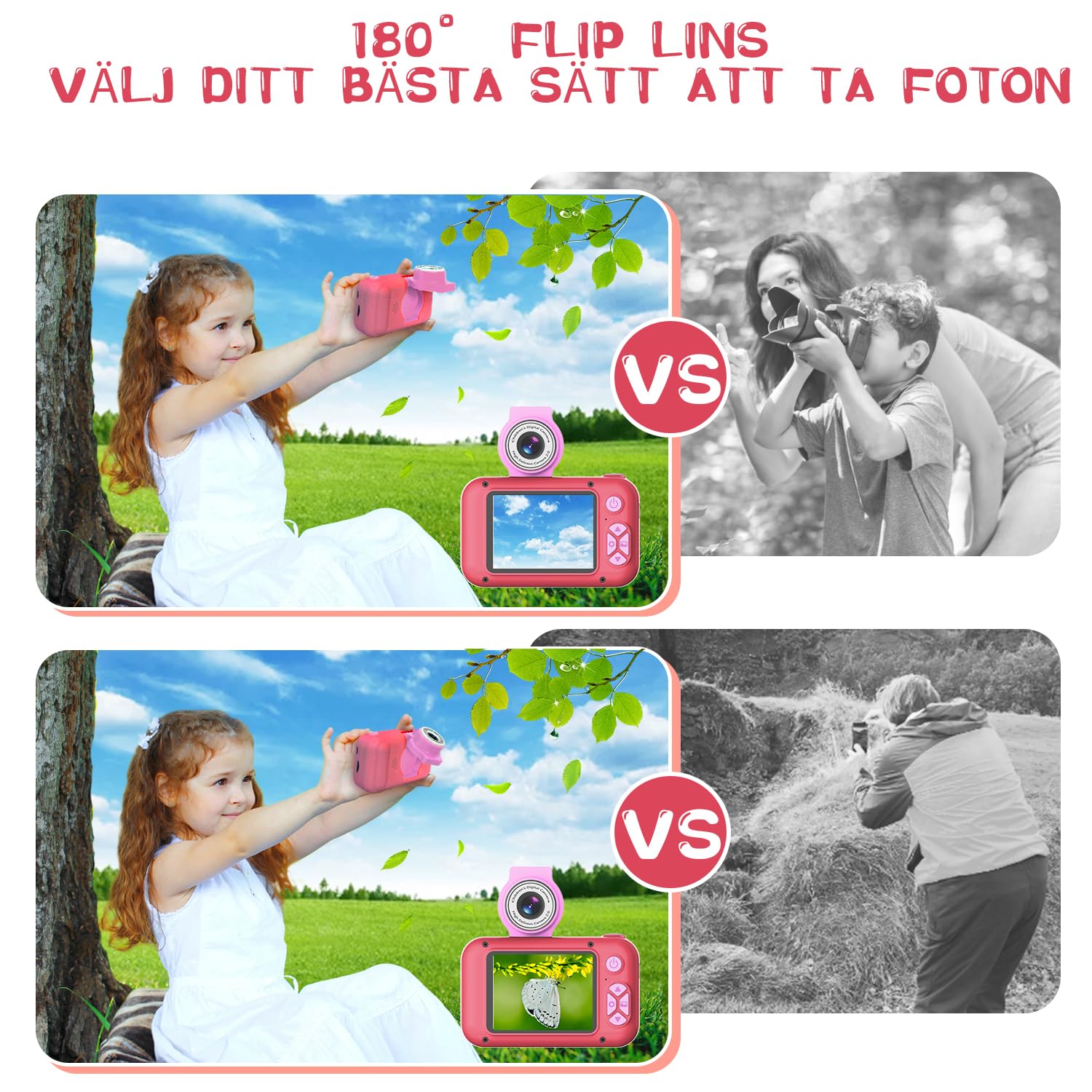 Kids Digital Camera - Ages 3-12 Designed for young photographers, this camera features a generous 2.4" IPS screen with 1080p resolution—superior to competing models with smaller displays. The ergonomic body fits comfortably in children's hands. A 180° articulating lens enables diverse shooting perspectives and intuitive self-portrait mode. The high-capacity 1000mAh battery delivers 2-4 hours of playtime. Pre-loaded with 31 creative frames and filters to enhance photos, plus 10 interactive puzzle games that develop problem-solving skills. The 32GB memory card captures extensive photo and video libraries. Setup is straightforward—simply adjust date/time and parameters to match your child's preferences. Includes USB cable, protective lanyard, and comprehensive manual. Responsive customer support ensures satisfaction.