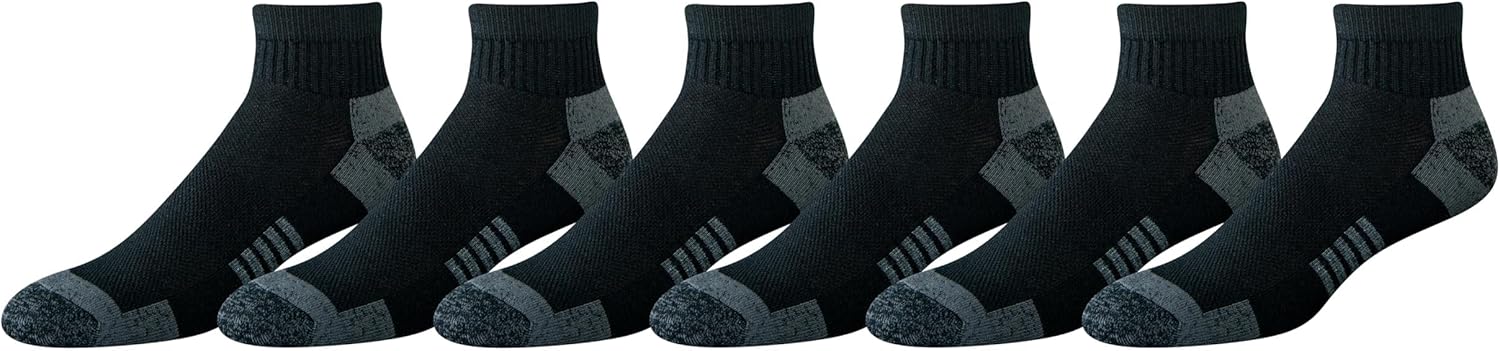 Six pairs of performance ankle socks engineered for comfort and durability. Crafted from a premium cotton blend with targeted cushioning on the ball and heel, these socks absorb impact during athletic activity. Mesh ventilation zones manage moisture while arch compression provides support and reduces foot fatigue. Reinforced heel and toe construction extends wear life. Machine washable for everyday convenience.